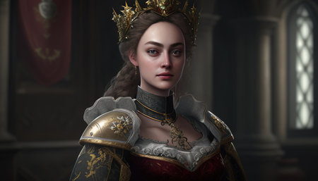 A regal queen, clad in a black gown, stands with knights and horses in a castle courtyard. The image displays a medieval aesthetic with stone structures and ornate details. The composition features rich colors and textures, suggesting a daytime scene suitable for historical or fantasy-themed projects.