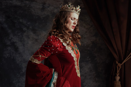 tired medieval queen in red dress with crown having backache on dark gray background.