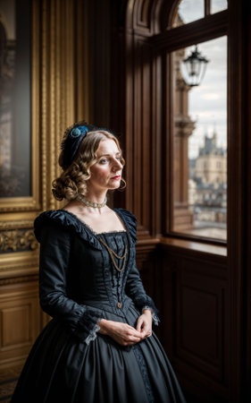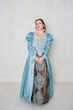 The Victorian era concept. Beautiful woman in elegant historical dress and hairstyle posing in vintage interior.