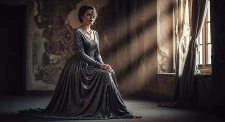 Woman wearing authentic Renaissance costome and headdress standing at her window in a medieval castle