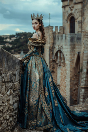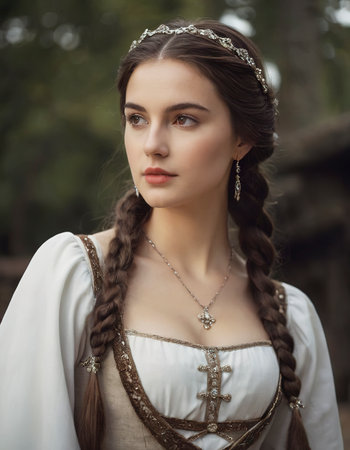 A beautiful young women in medieval costumes, portrait against the stone walls of a castle, fantasy style