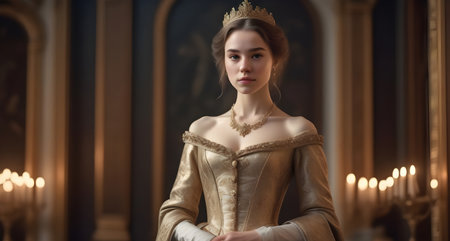 Beautiful young woman in medieval era dress and crown posing in royal palace interior