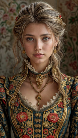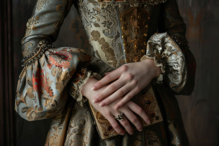 regal Elizabethan woman adorned in intricately embroidered gown Her dramatic expression conveys intrigue while holding delicate silk handkerchief