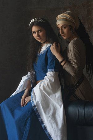 Portrait of a beautiful young woman in medieval era dress. Retro style.