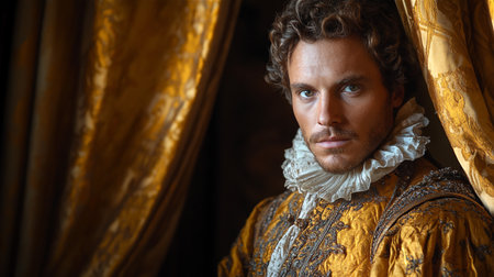 Portrait of a nobleman in elaborate golden Renaissance attire with intricate embroidery, a lace ruff, and intense gaze, framed by luxurious draped curtains in a dramatic, theatrical setting.