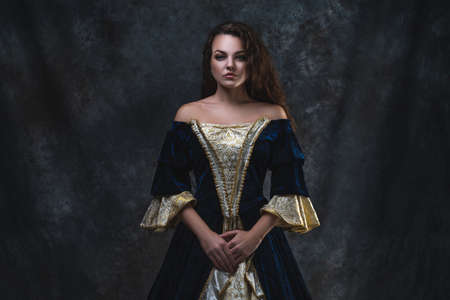 Beautiful woman in renaissance dress on abstract dark background, studio shot