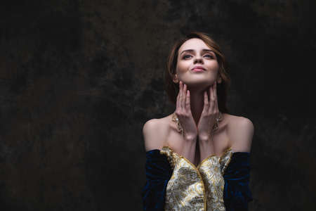 Beautiful woman in renaissance dress on abstract dark background, studio shot with copy space
