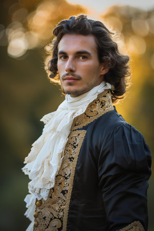 A graceful musketeer dressed in period garb, displaying courage and gallantry in a captivating Renaissance environment
