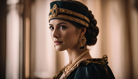 A beautiful woman wearing a lavish gold headpiece and elegant jewelry, posing for a portrait.