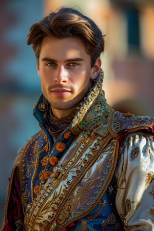 Caucasian prince in formal clothes looking at camera outside European themed castle.
