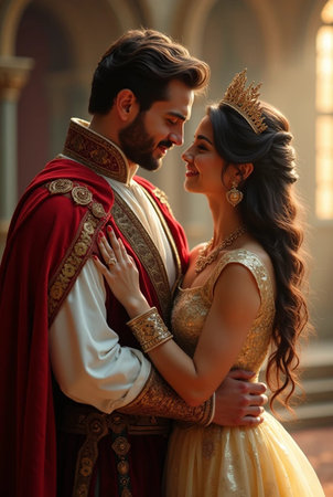 Royal romantic couple fantasy world. Fairytale king and queen affectionate bonding. Generate ai