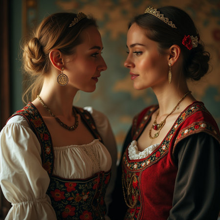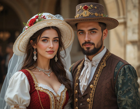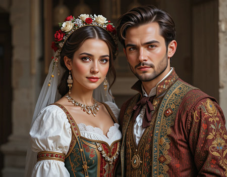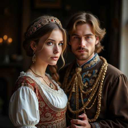 A striking couple stands together, exuding elegance and authority, dressed in luxurious historical costumes. The woman, adorned with a delicate crown and intricate jewelry, complements the man’s majestic fur-lined coat and elaborate hat, creating a captivating scene of royal grandeur.