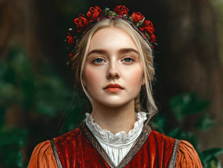 Beautiful young blonde woman in medieval dress. Portrait of a beautiful girl.