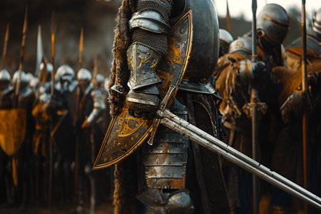 Medieval knights army in full armor standing in formation ready for battle. Warrior on battlefield