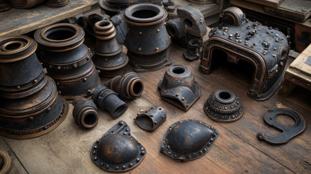 A captivating arrangement of vintage mechanical parts lies on a weathered wooden table, showcasing intricate designs, textures, and craftsmanship that reflect industrial heritage.