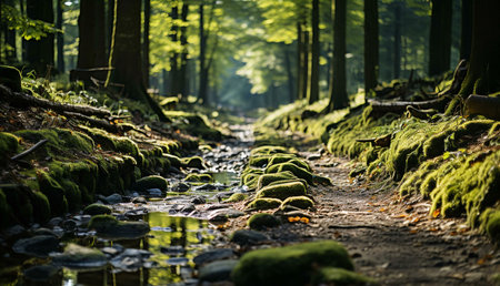 A tranquil forest path alongside a mossy creek. Sunlight filters through the trees creating a serene atmosphere.