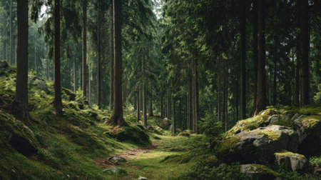 Forest background. Dark forest nature view,Magic green mossy sunny forest with conifer trees. . High quality photo