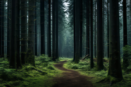 dusk misty forest landscape autumn season nature view with high trees and lonely orange trail foot path