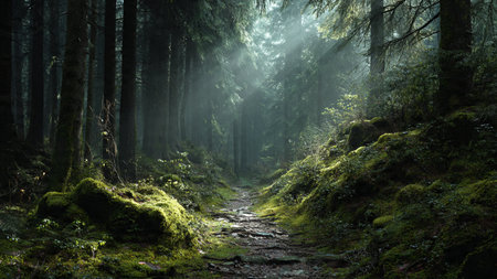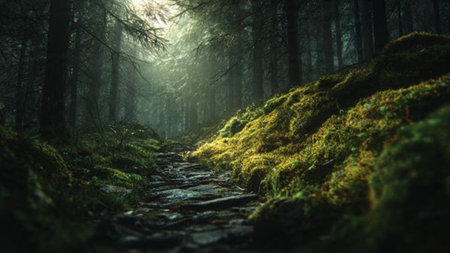 A mystical forest scene with a mossy path, ancient trees and sunlight filtering through the canopy.