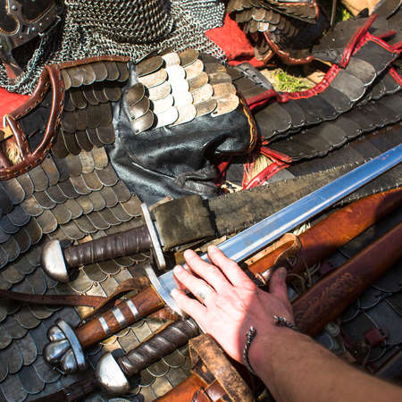Ancient sword in a knight of medieval warfare, detail of weapon and death