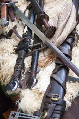 Medieval weapons replicas for close combat used in wars on display on animal fur