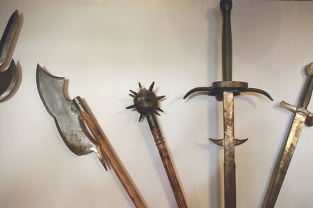 Lot of different medieval ancient swords and weapons. Metal iron two-handed swords, Mace scepter spear lance shaft pike glaive gad on a wall ,historical exposition . Concept of old fight .