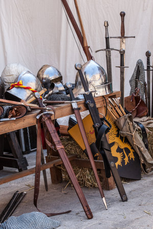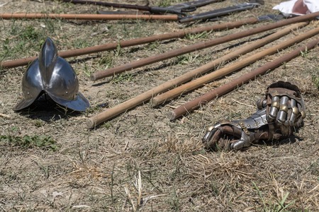 Detail of gloves and helmet as part of a metallic armor, on a reenactment with costumed characters and medieval armor with chainmail, helmet swords and shields. Medieval demonstration and recreation
