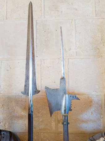 Set of Medieval Pikes Exposed with Limestone Background of Castle wall and Armor