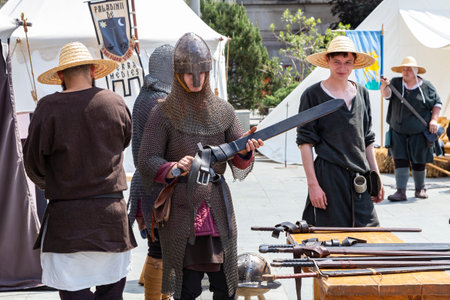 Craiova, Dolj County, Romania – May 14, 2022: Fighter in authentic historical clothing at a medieval festival Michael le Brave . Reconstruction of a medieval battle.