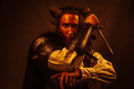 Cosplay character. Strong warrior with a sword in his hands. An angry hero, ready to attack