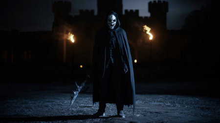 ghost halloween fear skeleton hood night horror death creepy evil. Generative AI.