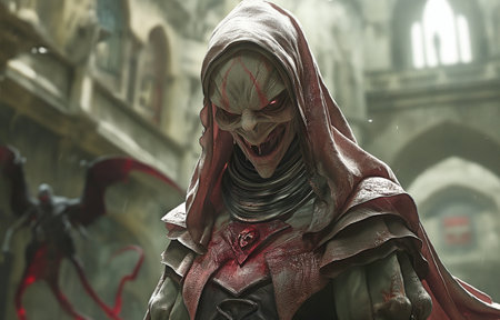 Shadowy individuals draped in black garments stand solemnly, their faceless masks glowing softly from candlelight, evoking a chilling, ritualistic scene amid aged stonework.