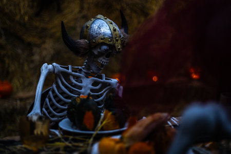 Halloween. Spooky Halloween skeleton with skull and bones in dark background, creepy horror decoration glowing in eerie light for Halloween night.