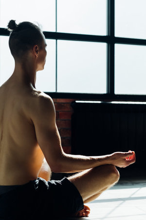 yoga enlightenment and serenity. meditation relaxing and mind clarifying. hot shirtless yogi in lotus pose. wellness and spirituality concept.