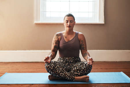 Portrait of African mature plump woman sitting in lotus position with her eyes closed and meditating during yoga