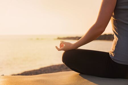 Close up of hands of unrecognizable woman holding hands in mudra practicing home yoga. Girl meditating and relaxing in lotus pose.