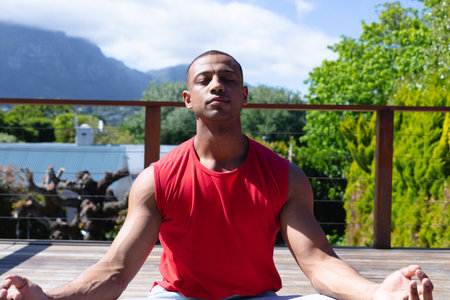 Young african american man meditating while practicing yoga at terrace on sunny day. people and healthy lifestyle concept, unaltered.