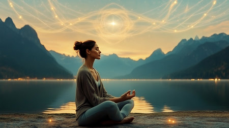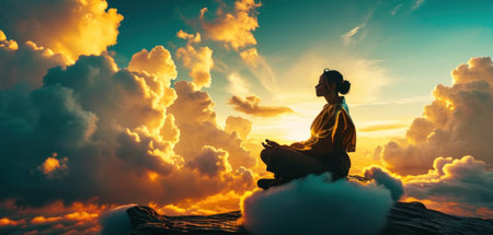 A woman sits outdoors in a meditative pose with eyes closed, embodying tranquility. The composition features soft lighting with a gradient sky and diffused elements. Colors include pastels and blues, suggesting a serene atmosphere. This image could be suitable for health, wellness, and lifestyle content.
