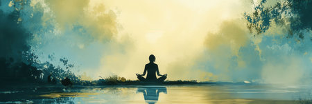 A person sits peacefully, practicing meditation by a tranquil water body, surrounded by lush greenery and bathed in soft natural light.