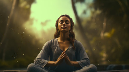 Serene Black Woman Finding Inner Peace Through Mindfulness Meditation in Lush Green Oasis