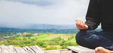 banner of man sitting on bamboo floor and meditation against nature green mountain with clound background with copy space