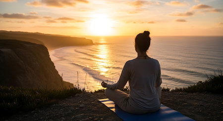 A young tourist Woman enjoying sunset over sea mountain landscape while sitting outdoor. Womens yoga fitness routine. Healthy lifestyle, harmony and meditation