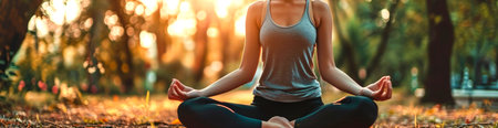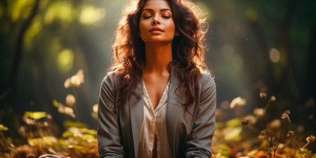 Meditative individual immersed in lush greenery and gentle sunlight, embracing tranquility and mindfulness in a peaceful natural setting