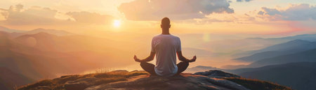 Tranquil meditation scene, individual amidst mountains at dusk, achieving mental balance, solitude in nature embrace, spiritual journey