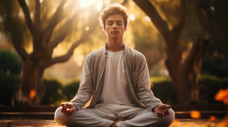 Mindfulness. Photo of a teenager in a peaceful garden, practicing mindful breathing, dressed in loose, comfortable clothing from the casual wear line