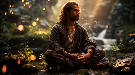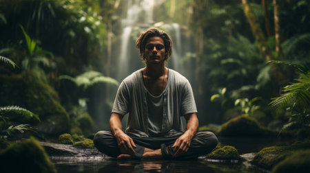 Young man meditating quietly in lush forest surroundings during early morning light for a peaceful mind
