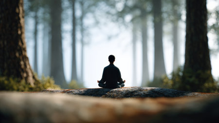 Man practicing yoga and meditation in a peaceful forest, surrounded by tall trees and fog, enjoying the tranquility of nature and finding inner peace