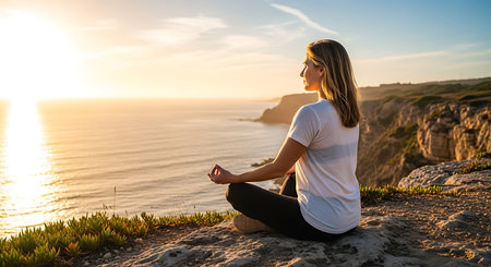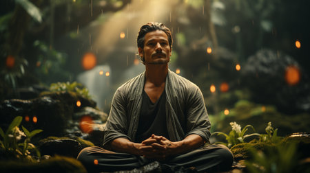 A serene individual is meditating in a stunning natural environment, surrounded by lush greenery. This peaceful scene captures the essence of mindfulness and tranquility, ideal for promoting wellness and relaxation themes.