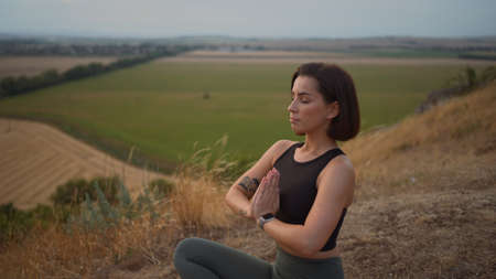 woman practices yoga and meditates in the lotus position on the nature. Girl Meditate at the Mountains. Woman meditating in the lotus position closeup