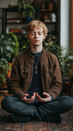 Young woman meditating peacefully indoors surrounded by lush green houseplants and natural light. High quality photo